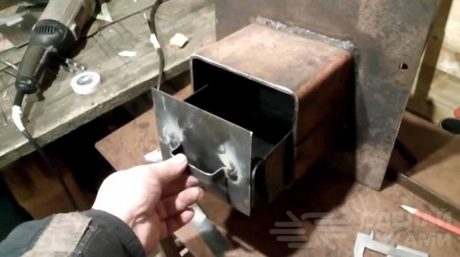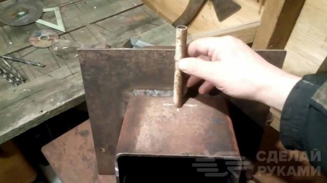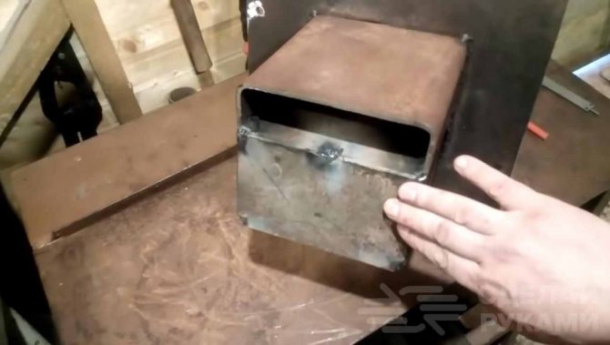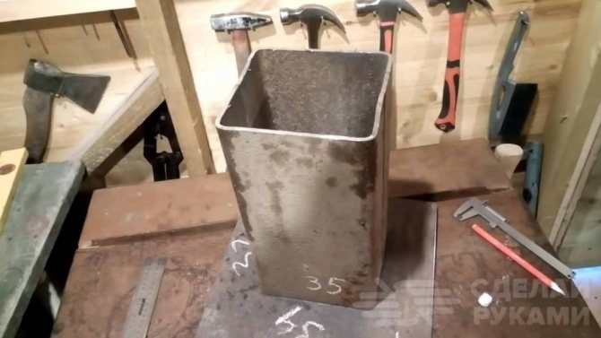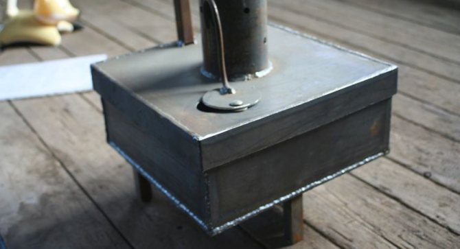 Une chambre de combustion primaire est réalisée par le bas. De l'huile usée y sera versée, qui dans le processus de combustion contrôlée sera chauffée et décomposée en fractions volatiles.Le dessus de cette chambre est fermé par un couvercle rond en acier de 4 mm d'épaisseur. Il doit être facilement enlevé si nécessaire, car la surface intérieure de la chambre doit être soigneusement nettoyée des scories chaque semaine.