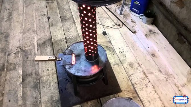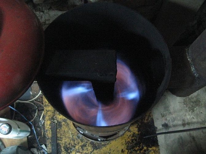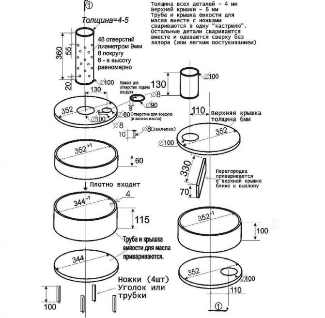 Un brûleur est constitué d'un tuyau de 20 cm de long et 10 cm de diamètre. La partie inférieure de celui-ci est perforée, faisant des trous d'un diamètre d'environ 2 cm. L'intérieur est nettoyé des bavures, sinon ils collecteront la suie sur eux-mêmes, ce qui rétrécira considérablement le trou plus tard.