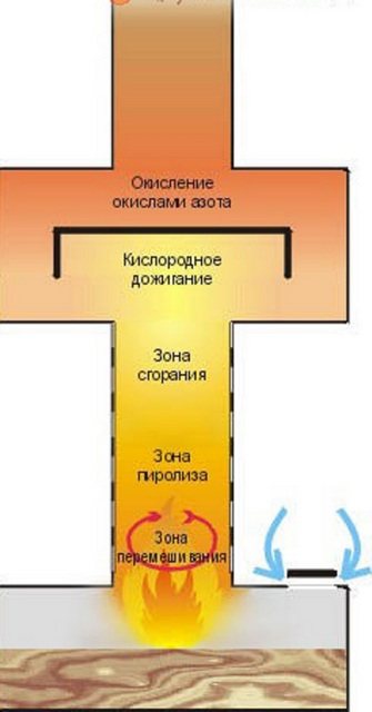 Dans un autre compartiment, situé au-dessus, les produits de combustion de l'entraînement, mélangés à de l'air, sont post-brûlés. Au premier stade, la température est relativement modérée et au deuxième stade, elle est beaucoup plus élevée - jusqu'à 800 ° C.