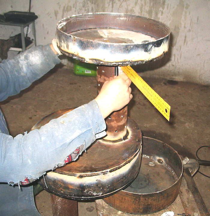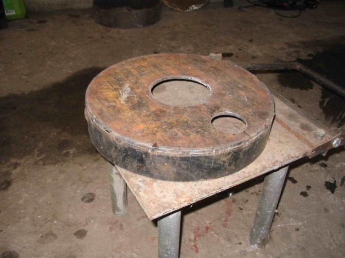 Souder le fond et le couvercle sur le disque de frein de voiture. Ce sera un bac d'égouttement ou un bol d'évaporateur. Pour fournir du carburant, une ouverture est laissée dans le couvercle par laquelle l'air pénètre dans le poêle. L'ouverture est assez large, sinon la poussée diminuera et l'huile n'entrera pas dans le bol.