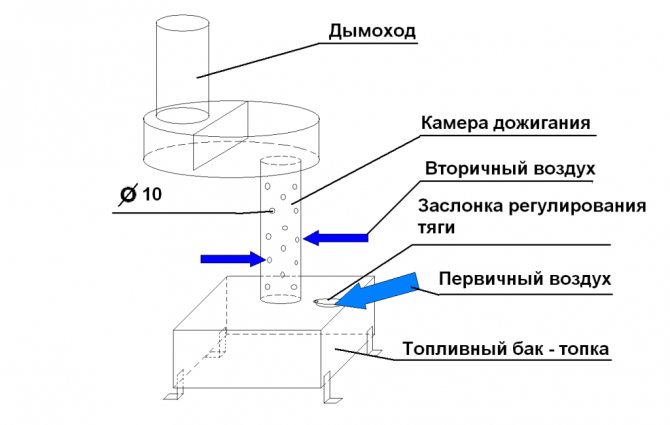 La conception du poêle représentée sur le dessin prévoit l'alimentation en combustible selon le principe de la gravité, et l'air pénètre naturellement dans la chambre de combustion, en raison du tirage dans la cheminée. Le nombre et le diamètre des trous sont également calculés pour de tels travaux. Il est important que le tuyau d'alimentation en carburant passe à l'intérieur de la post-combustion, ce qui permet de préchauffer le fonctionnement avant la combustion.