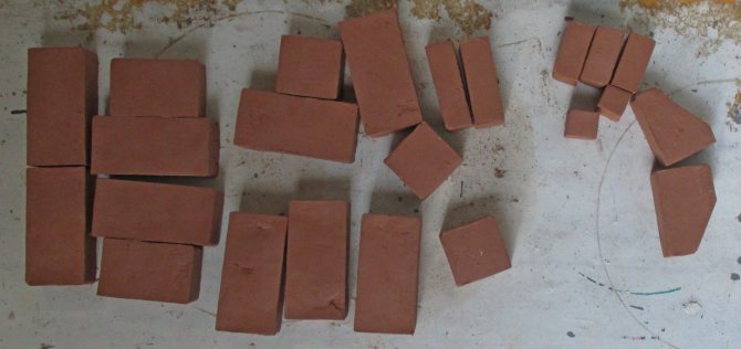 : Une vraie brique standard a des dimensions de 250x120x65 mm et un poids de 3600 grammes. La densité de la brique est égale à 1846 kilogrammes par mètre cube. Réduisons sa taille d'environ 6 fois. On obtient les dimensions linéaires 42x20x11 mm et un poids égal à 17 grammes.