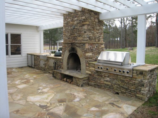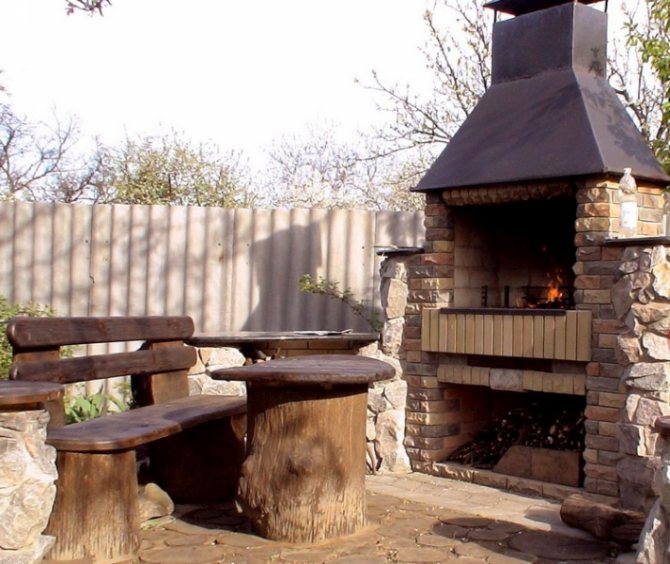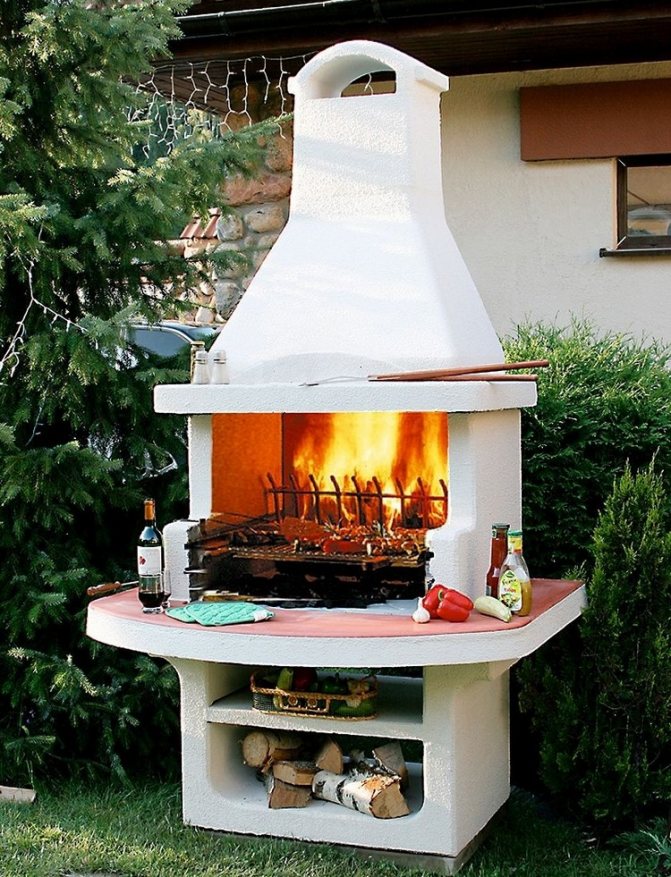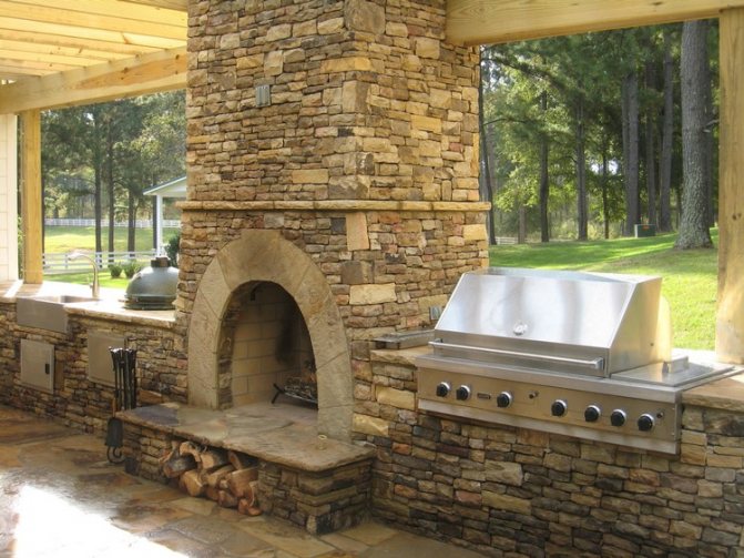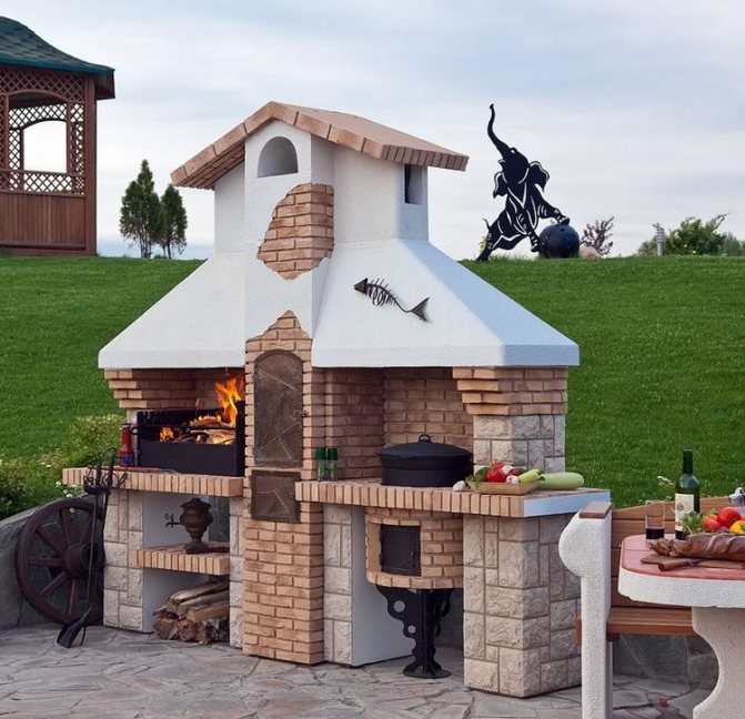 - BBQ intégré. Pour nous, le gril est associé à un barbecue ou à une façon de le cuisiner, bien que parmi de nombreux peuples du Moyen-Orient, il soit considéré comme un outil de cuisson universel. La chambre de combustion d'une telle cheminée est réalisée sous la forme d'un bol à parois verticales. Après avoir brûlé le bois, les charbons restants sont utilisés pour la friture, la cuisson et même le fumage des aliments. Une cheminée avec barbecue dans le pays est toujours en demande lors de la tenue de vacances en famille.
