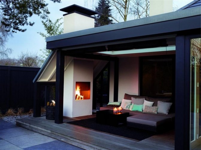 Lorsqu'elle est installée sur une terrasse, la cheminée est fixée au mur de la maison. Ils l'érigent dans le belvédère, le laissant passer à travers le toit. La conception en plein air n'a pas besoin de se conformer aux exigences de hauteur de la cheminée, mais elle ne peut pas être complètement exclue du modèle.