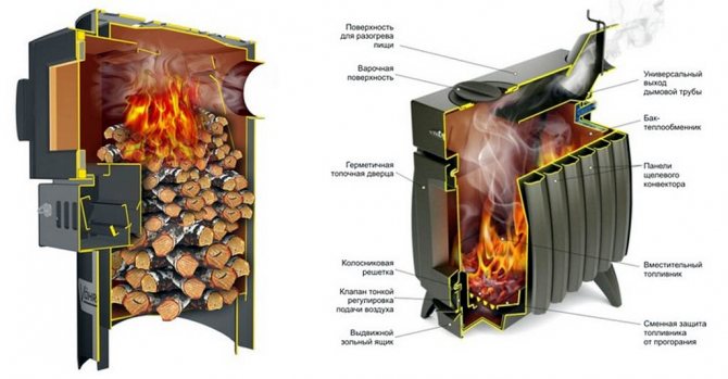 Le transfert de chaleur de l'appareil de chauffage peut être augmenté plusieurs fois si un poêle en fonte est placé au-dessus de la chambre de combustion. Son épaisseur affecte la durée de la période de dégagement de chaleur.