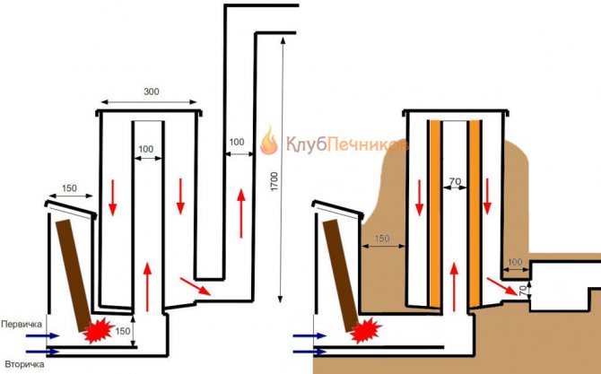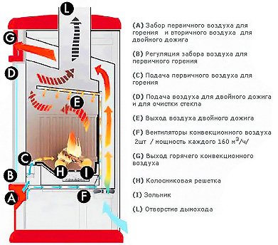 Le secret de l'efficacité de ce poêle réside dans sa conception originale, qui permet d'accumuler et de stocker la chaleur pendant une longue période. Pour comprendre le principe de fonctionnement d'un four à deux cloches, considérez son schéma structurel.