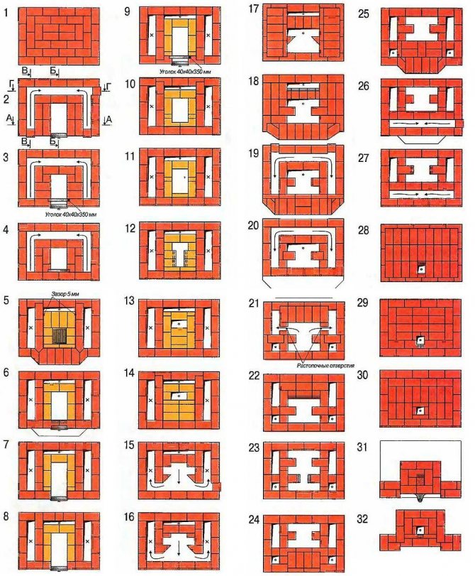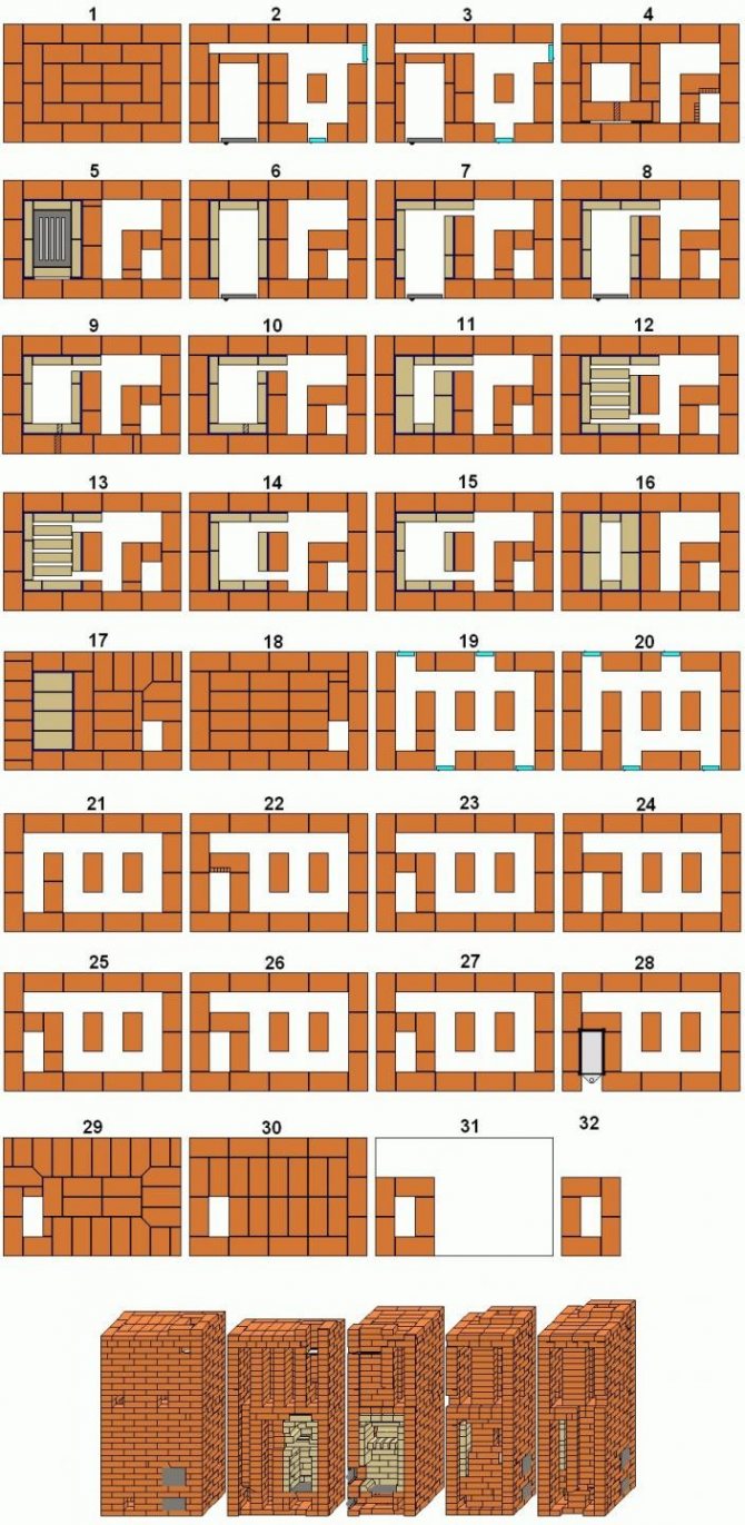 Lors du démarrage de l'appareil de la 6ème rangée, il est nécessaire d'utiliser une brique spéciale aux propriétés réfractaires en tant que matériau. Le plus souvent, un schéma développé par des cuisiniers qualifiés contient une note à ce sujet sous forme d'ombrage. Un tel indice vous permet de simplifier le processus de maçonnerie et d'éviter d'éventuelles difficultés lors de l'exécution de ces travaux;