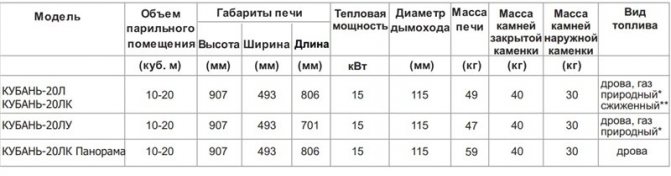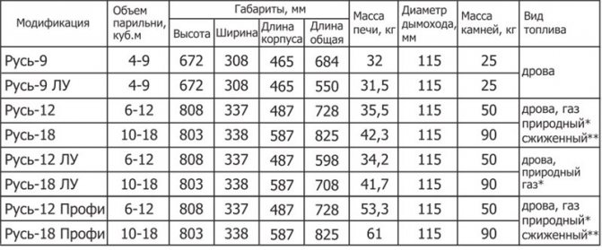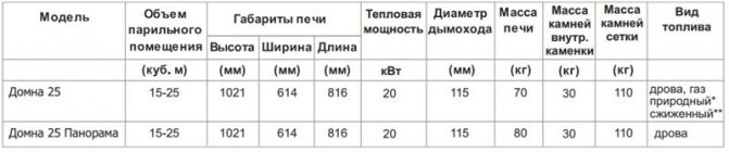 Tous sont petits et relativement légers - de 32 à 52 kg. Le volume du réservoir d'eau varie de 55 à 80 litres et le diamètre de la cheminée est de 115 mm. Le poids minimum des pierres à poser est de 25 kg, le maximum - 90 kg.
