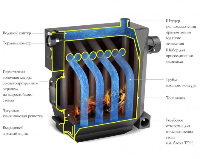 - Conçu sur la base de la chaudière à eau chaude populaire, à la différence que maintenant pas l'air, mais l'eau est chauffée dans des tuyaux de convection