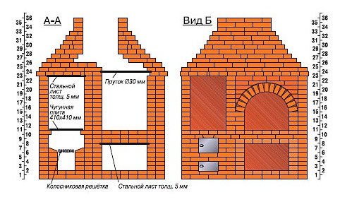 Faites attention aux coins du four - ils sont faits de briques de céramique teintées et à l'organisation du cendrier. Les coins de la brique sont coupés à un angle de 45 degrés. Cela simplifie grandement la chute naturelle des cendres dans le cendrier.