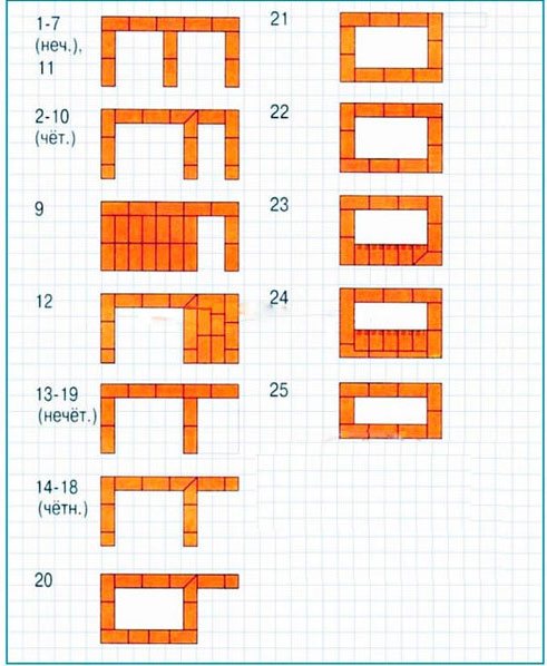 A partir du sixième, on passe aux mégots (maçonnerie transversale). Il devrait s'avérer que la brique sera sur les rebords de chaque côté (plan). Ils sont nécessaires pour le dispositif du treillis, son emplacement correct dans le futur.