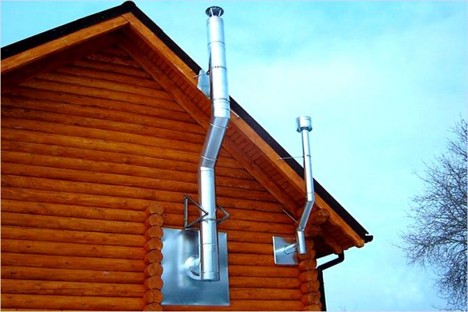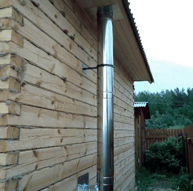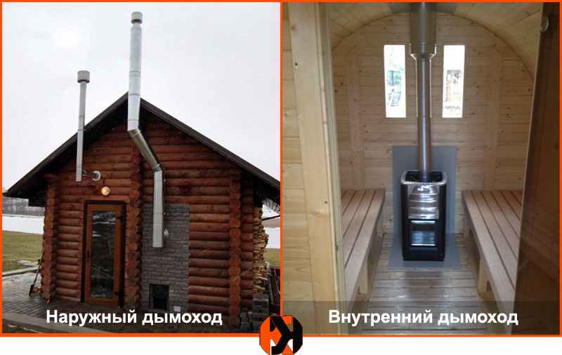 Pour le bain, on utilise principalement des cheminées internes, elles ont une configuration plus appropriée et sont plus efficaces en fonctionnement. Les options extérieures sont utilisées dans les grands bâtiments de plusieurs étages et produisent souvent de la fumée à partir de plusieurs poêles. L'avantage des structures externes est la possibilité de drainer le condensat dans des poches spécialement équipées, ce qui réduit le taux d'encrassement de la surface intérieure du tuyau avec de la suie.