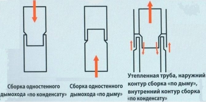 Les tuyaux en acier pour la ventilation des gaz sont généralement assemblés à partir de sections insérées les unes dans les autres. De plus, il est nécessaire de monter la cheminée de manière à ce que le condensat à l'intérieur du conduit de gaz puisse s'écouler sans entrave. C'est-à-dire que la section supérieure est insérée dans la section inférieure, c'est ce qu'on appelle un ensemble «condensat». Comme pour les sandwichs modulaires, le tube intérieur de la section supérieure insérée doit entrer dans celui du bas, et le tube extérieur doit saisir le boîtier de la partie inférieure de l'extérieur. De cette façon, les précipitations sont éliminées, s'écoulant calmement vers le sol.