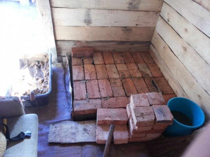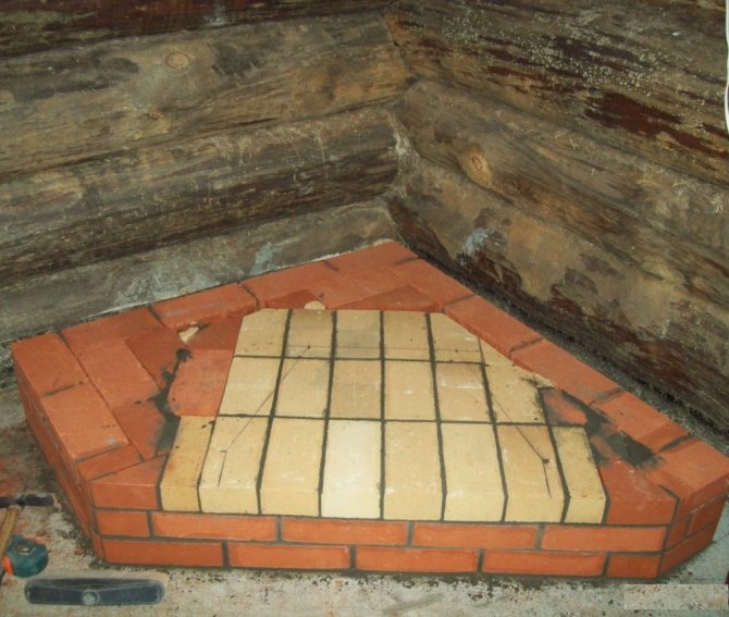 La hauteur de la fondation, en saillie au-dessus de la surface du sol, est de 20 cm, elle est «retirée» sous le niveau du sol à l'aide d'une couche d'isolation thermique. Il est aménagé en briques résistantes à la chaleur "solides". La solution est la même composition qui sera appliquée plus tard.
