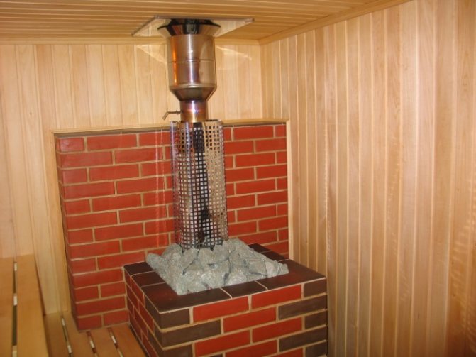 Les modèles avec une finition à l'intérieur du puits à l'aide d'une pierre de bain sont très populaires. Cette option empêche les éclaboussures d'eau des pierres de pénétrer dans l'espace entre l'écran et le four. Et c'est bien, car la chamotte chauffée et, de plus, la brique rouge sont facilement détruites par l'eau chaude.