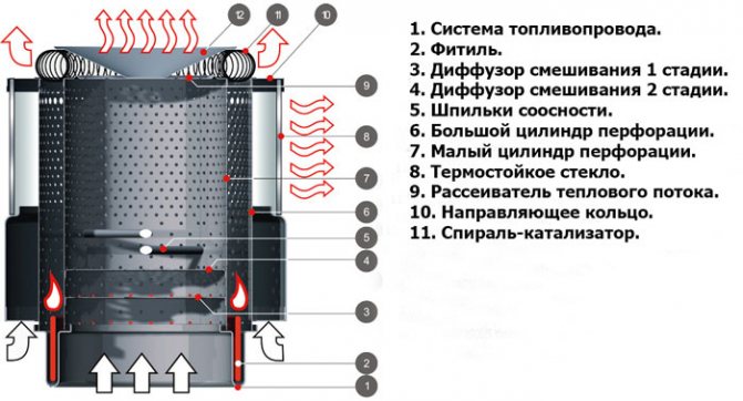 Des cylindres spéciaux situés dans la chambre de combustion offrent la possibilité d'utiliser le mode de chauffage infrarouge, ainsi que la convection. La surface en acier inoxydable chauffe jusqu'à 800 ° C et commence à réchauffer l'air de la pièce, et les rayons infrarouges, réfléchis par l'écran, chauffent les objets situés dans la pièce.