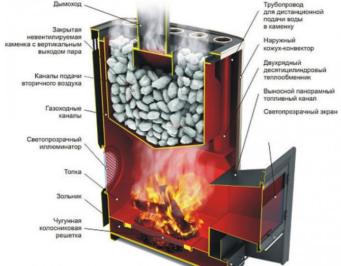 Donc, si vous ne pouvez pas assembler un poêle-cheminée pour un bain de vos propres mains, vous devez l'acheter, mais dans ce cas, nous ne pouvons parler que d'une structure en acier. La condition principale pour une telle conception est un corps en métal réfractaire et à haute résistance, qui chauffera rapidement et efficacement les pierres pour le transfert ultérieur d'énergie thermique dans toutes les pièces du bain.