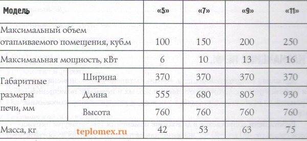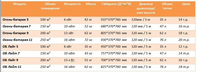 Tous diffèrent par la puissance, les dimensions, le poids et le nombre de paires de convecteurs latéraux, qui sont indiqués par le numéro immédiatement dans le champ du nom du four. Par exemple, le four Fire-Battery 5 dispose de 5 paires de convecteurs à convection sur son corps, etc.