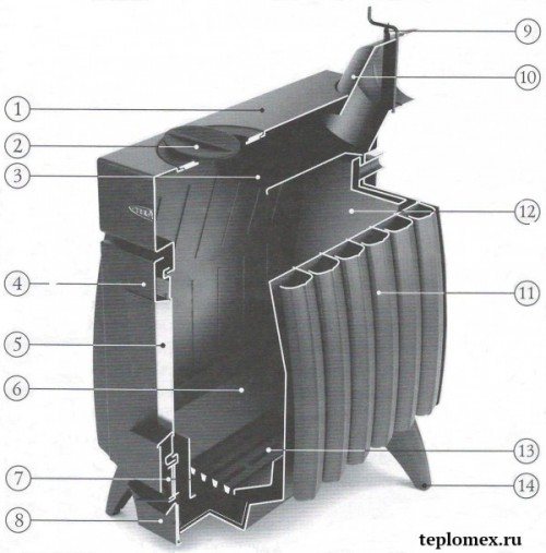 1- plaque de cuisson 2- brûleur 3- déflecteur 4- porte 5- écran 6- protection du foyer 7- vanne de commande 8- cendrier 9- registre de cheminée 10- tuyau de cheminée 11- convecteurs latéraux 12- circuit d'eau (sur certains modèles) 13 - grille 14 - pieds