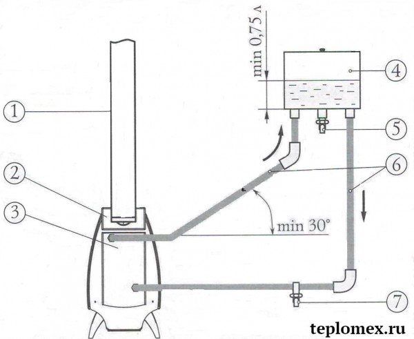 1- cheminée 2- four 3- échangeur de chaleur pour l'eau 4- réservoir d'eau 5,7- vannes à bille 6- tuyaux