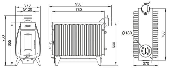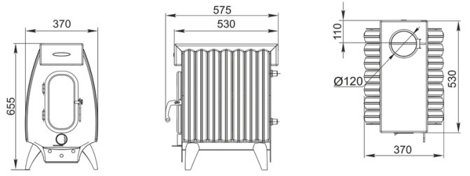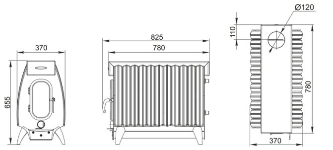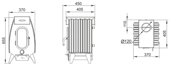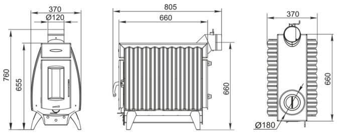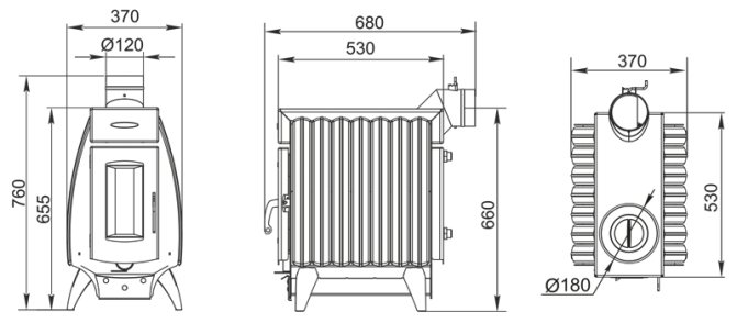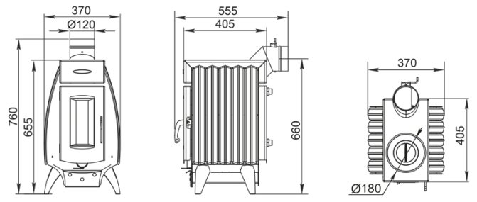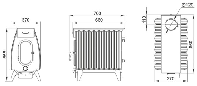 Le poêle se compose d'un corps en acier entièrement soudé, recouvert d'une peinture résistante à la chaleur, avec une chambre de combustion de 3 mm d'épaisseur. Sur les côtés de la structure, il y a des convecteurs à fentes spéciaux, qui permettent d'augmenter l'efficacité du chauffage de l'air dans la pièce.