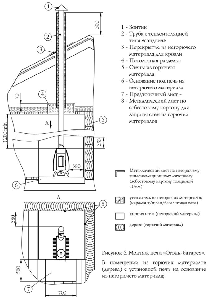 - Règles d'isolation et de sécurité - la température de la fumée dans la cheminée à la sortie du four atteint 450-550 ° C. La porte se réchauffe jusqu'à une couleur cramoisie brillante. Lors du passage à travers les dalles de plancher et les toits, il est impératif de réaliser une coupe-feu remplie d'isolant incombustible.