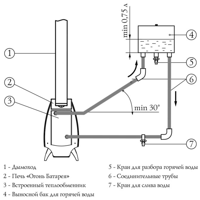 La présence de la lettre «B» dans le nom de la modification du four à batterie au feu (par exemple, le four à batterie au feu 9B) signifie la présence d'un réservoir d'échangeur de chaleur à l'intérieur de la chambre de combustion du four. Il est conçu pour chauffer l'eau domestique. L'échangeur de chaleur lui-même a un petit volume - 1,3 litre, mais est capable de chauffer de l'eau dans un réservoir distant attaché d'un volume allant jusqu'à 100 litres. Pour cela, le réservoir à distance et l'échangeur de chaleur doivent être connectés avec des tuyaux ; des buses pour le raccordement du système de chauffage de l'eau font saillie sur la paroi arrière du four (filetage extérieur G3 / 4). Le principe de fonctionnement de l'échangeur de chaleur à réservoir est basé sur les propriétés physiques de l'eau chaude pour monter et de l'eau froide pour descendre. Ainsi, ayant créé une opportunité pour la circulation de l'eau dans le système de chauffage, l'eau du réservoir distant est progressivement chauffée et vous avez la possibilité de laver ou de laver à l'eau chaude.