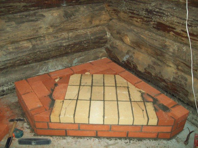 À l'aide de briques de clinker, un podium est réalisé, mais cette étape n'est pas considérée comme nécessaire. Au lieu de la brique, de la pierre ou des carreaux de céramique durables conviennent. Cela est vrai pour les personnes de grande taille qui ont acheté un petit appareil ou envisagent de construire un poêle bas.