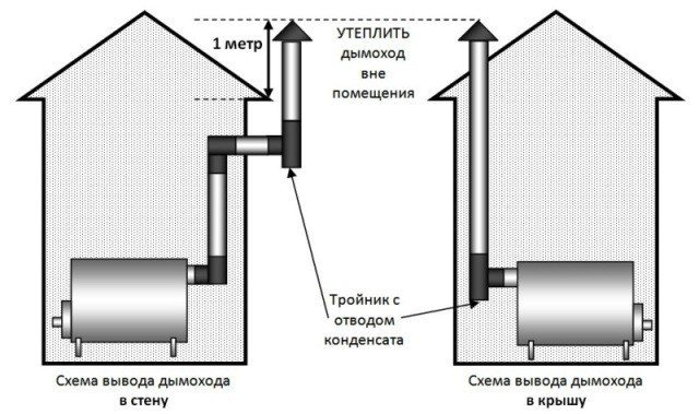 La cheminée peut être sortie en biais par rapport au mur. Dans ce cas, il est nécessaire de veiller au raccordement étanche des sections de la structure de la cheminée. Dans la plupart des cas, une structure sandwich est utilisée, qui présente un niveau de sécurité élevé du fait que le tuyau de cheminée est partiellement isolé dans la structure. Pour la structure de la cheminée, il est interdit d'utiliser de l'acier inoxydable mince, car il brûlera rapidement. Le tuyau doit être sorti à l'extérieur par un trou percé dans le mur ou le toit. À la fin, les fissures résultantes doivent être recouvertes d'argile.
