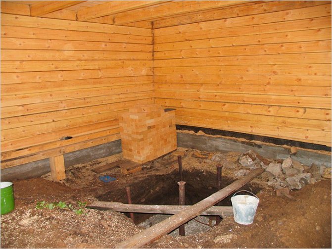 Pour la fondation en béton, une fosse est extraite sous la profondeur de congélation... Le fond est recouvert de sable et de gravier. Ensuite, le coffrage est placé sur les bords de la fosse et il est coulé avec du béton.