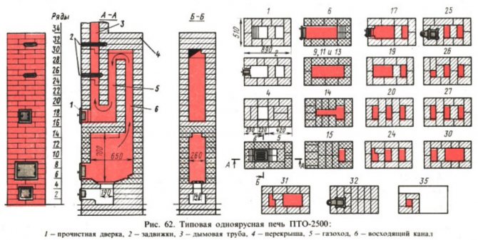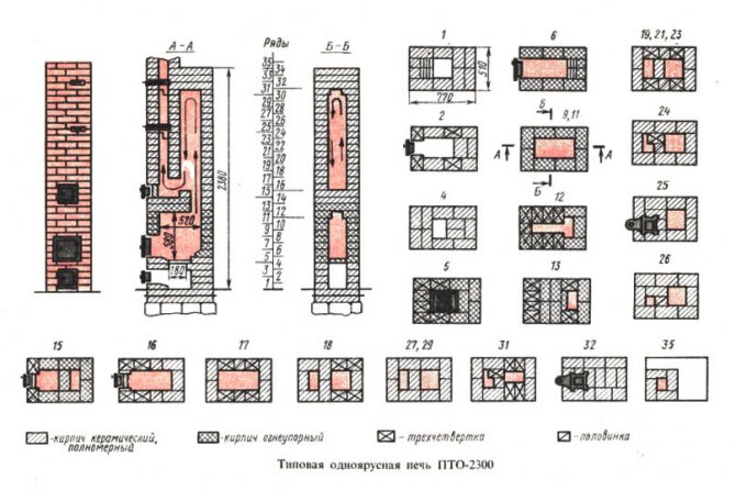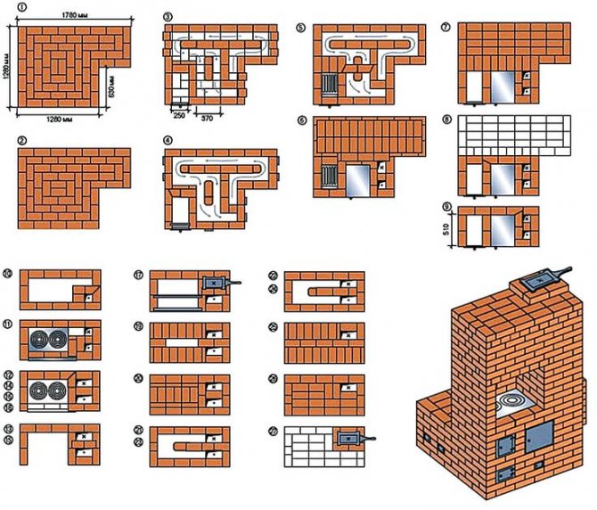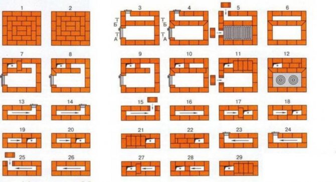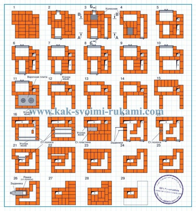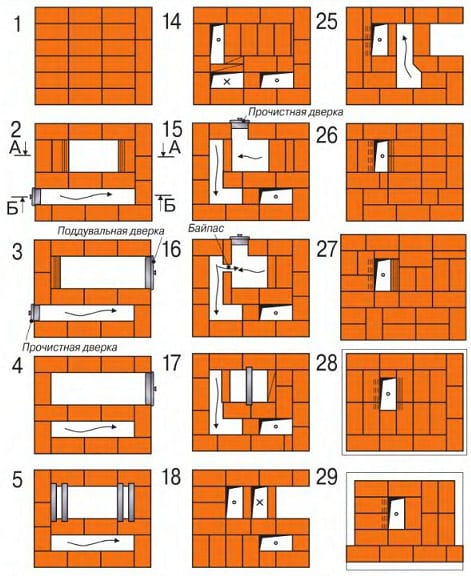 - Le conduit du poêle créé précédemment doit être fermé, ce qui entraîne la formation de trois nouveaux conduits. Au même stade, la maçonnerie implique l'installation d'une porte de combustion, pour laquelle la sixième rangée sert de support.
