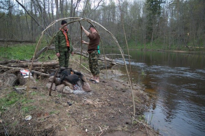 Pour le montage du cadre, vous pouvez prendre des racks en bois, en aluminium ou en fibre de carbone. Mieux vaut, bien sûr, utiliser des poteaux pré-préparés en matériau ignifuge. Mais si nous parlons de conditions de terrain, des branches épaisses conviennent à la construction d'un cadre jetable.
