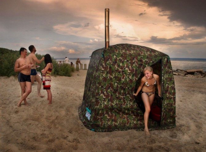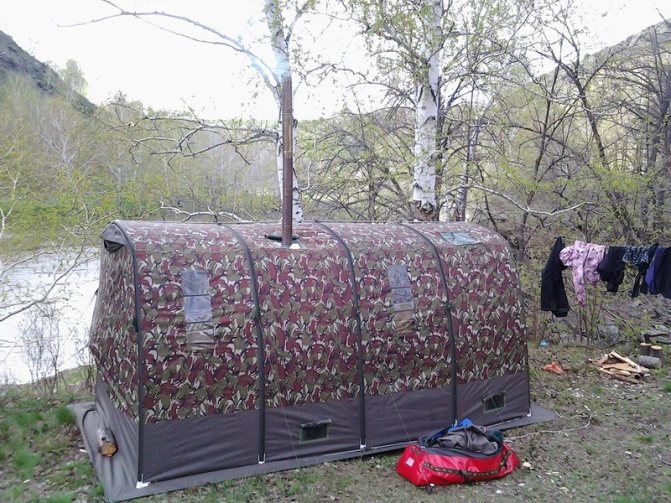 Des tentes spéciales sont vendues pour un poêle en métal fait maison avec une cheminée. Ici, il convient de veiller à la sécurité des personnes dans les bains, car un hammam de camping, même dans la nature, permet de travailler avec le feu. Par conséquent, lors de la fonte du poêle, il est important de ne pas en faire trop avec du carburant, afin que des langues de flammes enflammées ne sautent pas hors de celui-ci.