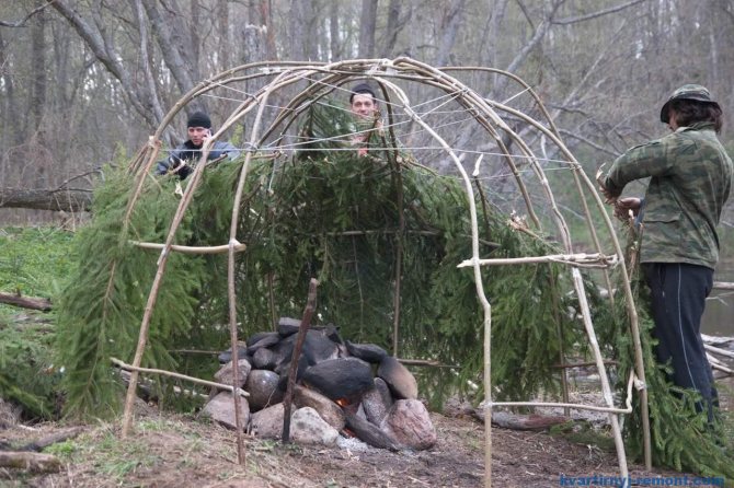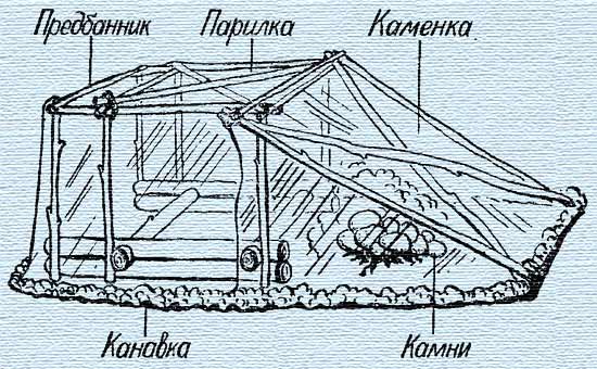 L'une des options pour une structure de camping que les touristes ou les pêcheurs utilisent pour cuire à la vapeur dans la nature comprend nécessairement un cadre fait de bâtons solides et épais. Il doit être recouvert d'une feuille d'aluminium ou d'une bâche. À l'intérieur de la structure, un poêle est équipé, qui servira de moyen de chauffage. Sa taille doit être plus petite que le service vapeur lui-même. Le hammam lui-même peut être divisé en un hammam et un dressing. Pour une meilleure isolation thermique et créer des conditions confortables à l'intérieur de la structure, des bûches sont posées le long des murs.