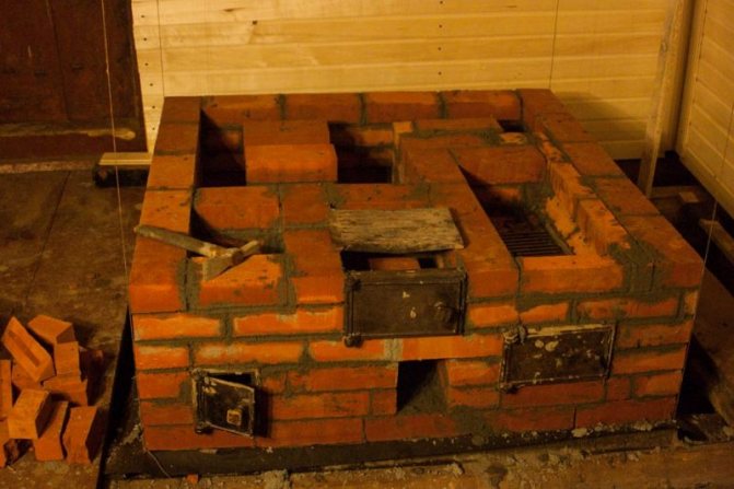 Cinquièmement - la barrière des colonnes devient solide et se connecte aux murs. La porte du grand ventilateur est fermée et le périmètre du grand ventilateur est réduit avant d'installer la grille. Pour le moment, sous la cloison, des torsions devraient se former, à travers lesquelles la fumée s'écoulera de la première section à la seconde. Pour augmenter la masse qui accumule la chaleur à l'intérieur, la cloison est bordée de briques disposées le long et en travers.