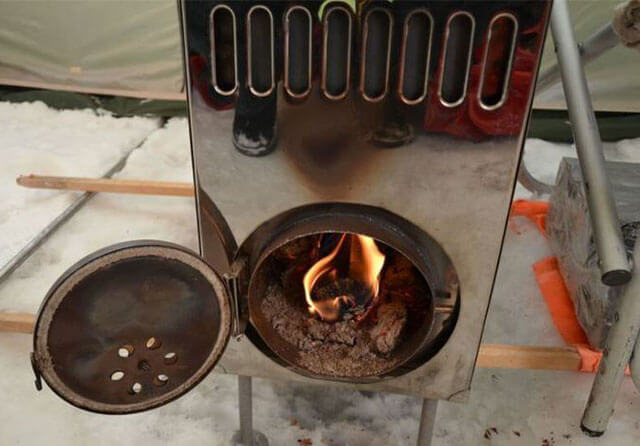- La deuxième méthode est réalisée dans une chambre de combustion fermée avec une grille, cette chambre de combustion est recouverte par le haut d'une plaque de cuisson à deux brûleurs. Une particularité du modèle est que le poêle joue le rôle d'une étagère devant le creuset.