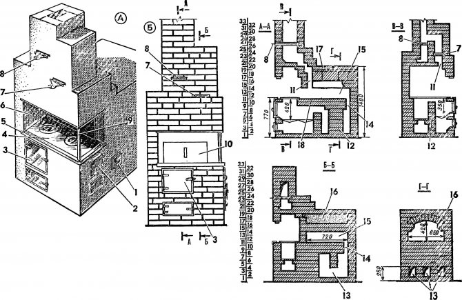 Les deux chambres de combustion inférieures (2 et 3) ont leurs propres grilles et portes, au-dessus d'elles se trouve une plaque en fonte (5), avec des anneaux concentriques. Les produits de combustion se déplacent le long du chemin: un petit foyer, un grand, après le tour des chambres de chauffage et de cuisson. L'accès à l'espace, appelé le six, est ouvert de deux côtés. L'angle de suspension du surtube est supporté sur un support à partir d'un angle ou d'un tuyau (11). Pour renforcer le mât le plus extérieur, un coin métallique est utilisé, appelé faïence (4 et 10).Un 25ème coin de 3 mm d'épaisseur est utilisé, qui, comme les portes, est souhaitable pour être muré dans les coutures à l'aide d'un fil. L'espace de cuisson peut être fermé avec un volet (12) avec une poignée.