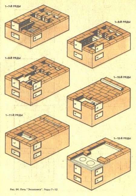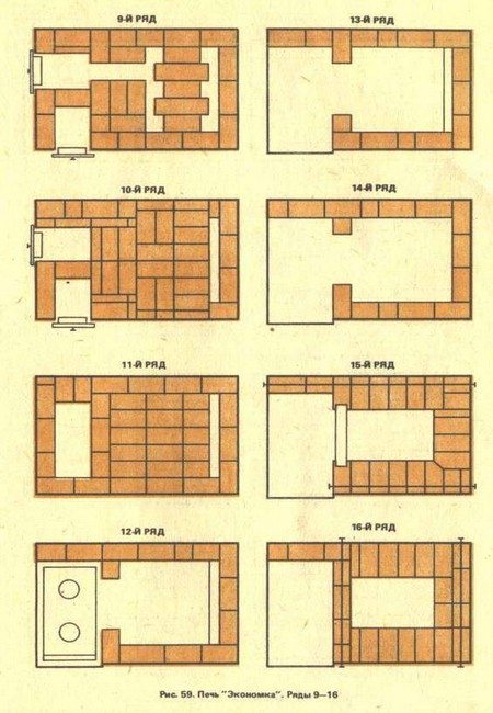 Dans le suivant, le chemin de sortie se chevauche par le haut, avec la moitié de la chambre de chauffage. En fait, il s'agit de la première couche du double fond du creuset lui-même. Nous laissons l'espace ouvert par lequel la fumée entrera dans la salle de cuisson. Il s'étendra d'un mur à l'autre et fera un quart de large. Sur le côté coupé, vous pouvez voir qu'en dessous, il se compose de deux couches posées à plat. Il est soutenu par de la maçonnerie au-dessus des plis. Lorsque vous l'utilisez pour la cuisson, il doit être chauffé comme un russe, en nettoyant en dessous si nécessaire. Si la chambre de combustion principale est allumée, la chambre de cuisson et la cuisinière peuvent être utilisées. Il est à noter qu'un four plus petit brûle le combustible plus vigoureusement, tout en étant moins exigeant.