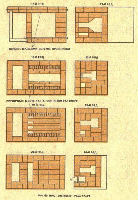 Toutes les grilles seront posées dans la sixième couche et se chevaucheront légèrement. Le chevauchement avant et arrière de la petite grille, il est souhaitable de faire biseauté, cela peut être vu sur le schéma. Ainsi, les charbons rouleront vers le centre, ce qui facilitera la combustion du bois de chauffage même humide dans un petit foyer.