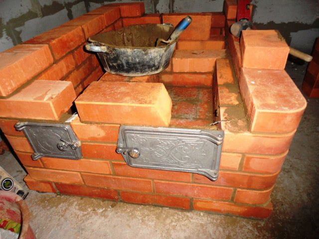 - En remplissant le rang 27, recouvrir le dessus du poêle en ne laissant que le 3ème canal vertical sans se toucher. Augmentez le périmètre de la maçonnerie de quatre centimètres. Au rang 28, formez un côté et augmentez à nouveau le périmètre de quatre centimètres.