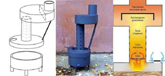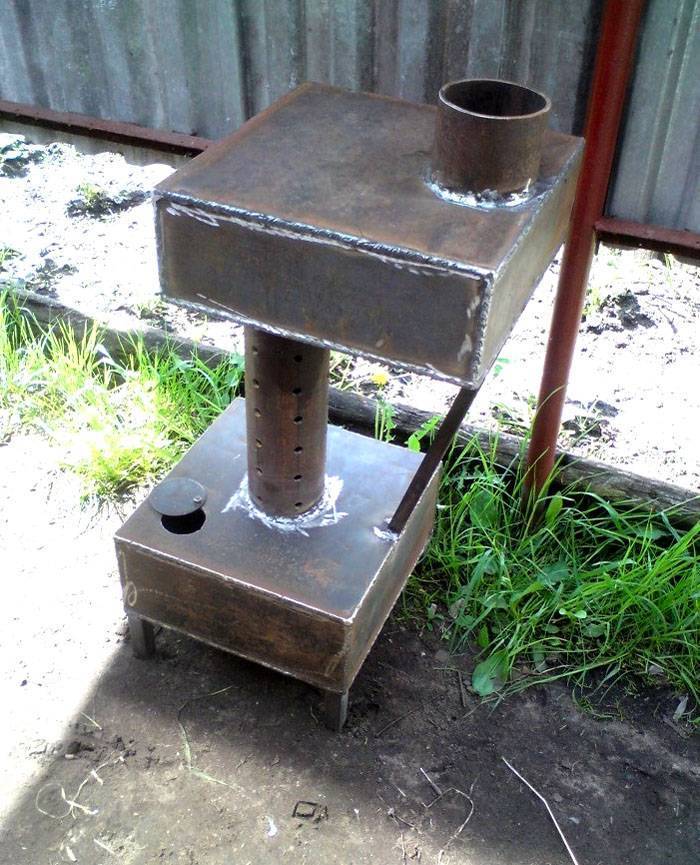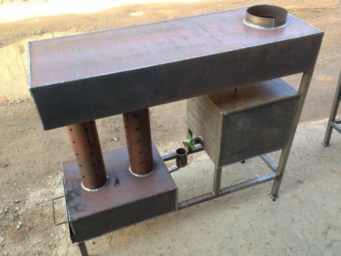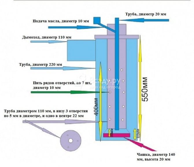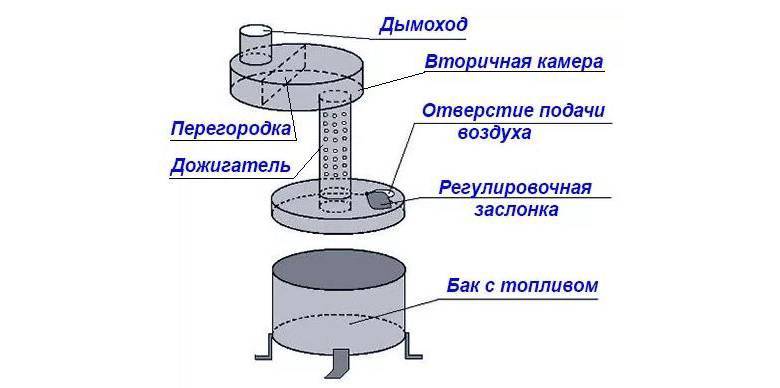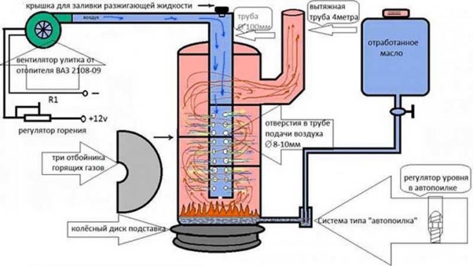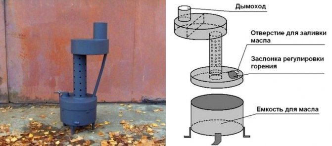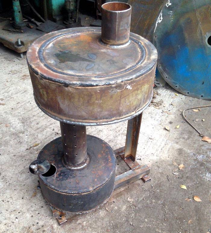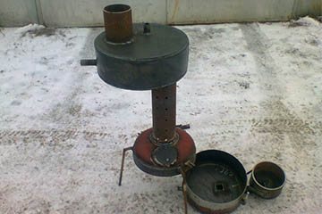 - Le four est rond, soudé à partir de tôle d'acier. Le réservoir de carburant est combiné avec la chambre de combustion. La chambre de postcombustion est un tuyau perforé et une chambre supérieure équipée d'une cloison de séparation qui divise la flamme. Un trou est découpé dans le couvercle de la chambre inférieure, où l'extraction est versée, et de l'air y entrera également. Le principe est le suivant : plus le registre est ouvert, mieux l'huile brûlera.