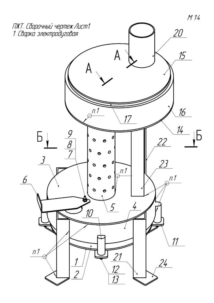 - Des parties du compartiment supérieur sont soudées à partir d'un tuyau d'un diamètre de 352 mm et d'une hauteur de 100 mm. Le fond est soudé à partir d'une tôle d'acier, dans laquelle un trou pour un tuyau perforé est prévu.