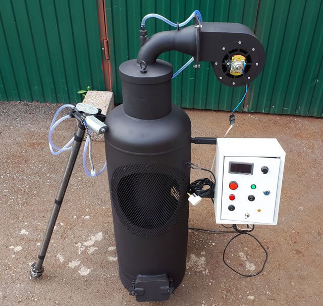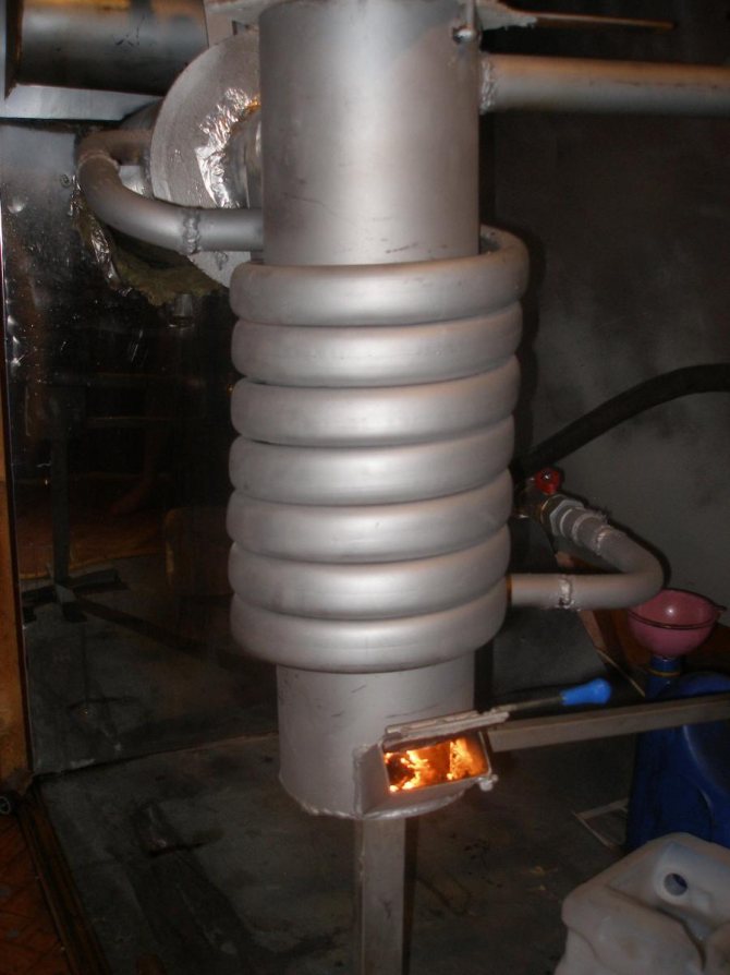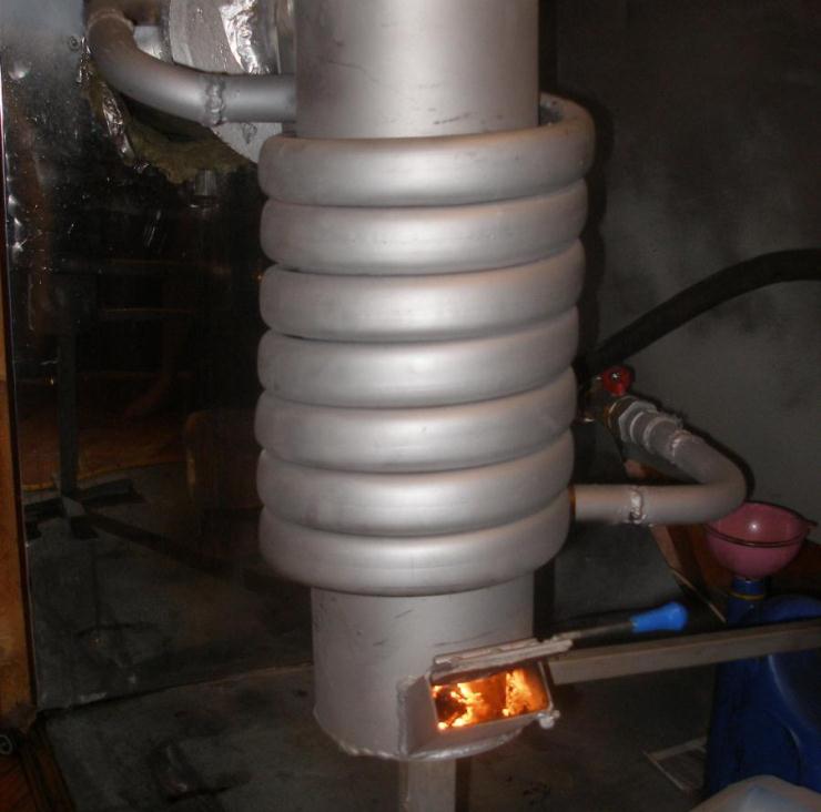 - Modèle pratique d'une chaudière minière avec un circuit d'eau à partir d'une bouteille de gaz avec un dessus coupé. Ici vous pouvez envisager une alimentation automatisée de travail. La conduite d'huile est située dans la chambre de combustion. Le circuit d'eau ressemble à une chaudière à travers laquelle passe la cheminée. Ou il peut s'agir d'un serpentin d'échangeur de chaleur en cuivre, qui est enroulé autour du corps du four.