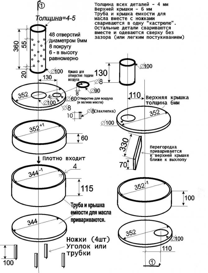 Tout d'abord, tous les détails sont coupés et préparés : un élément d'un tuyau plus petit de 36 cm de long, faites-y 48 trous ronds avec une perceuse. Ensuite, un récipient pour l'huile de 11 cm de haut est découpé dans une pièce plus grande, la deuxième partie de 6 cm de long doit s'insérer étroitement dans la première. La longueur du troisième élément est de 10 cm.Un couvercle avec un trou pour une cheminée, un fond et une vanne avec une ouverture centrale pour un réservoir de carburant, un volet pour l'alimentation en oxygène sont en acier. De plus, une cloison est préparée en acier, soudée au couvercle supérieur. Quatre pattes sont coupées dans les coins.