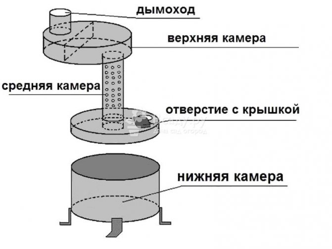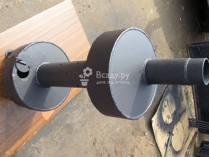 - La chambre supérieure est soudée au couvercle sur lequel la cheminée est installée. La chambre supérieure est reliée à un tuyau perforé. Vous pouvez renforcer la structure en la tirant vers le bas avec une barre de fer.