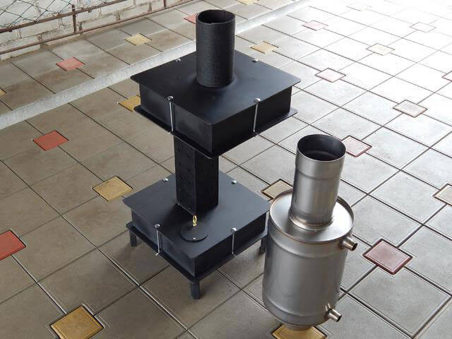 La chambre inférieure doit être équipée en plus d'une ouverture spéciale avec un registre afin que le tirage et la température de combustion puissent être contrôlés. Pour organiser le circuit d'eau au-dessus de la chambre supérieure ou autour du canal de la cheminée, un réservoir est installé avec des raccords soudés pour l'alimentation et la sortie du liquide de refroidissement.