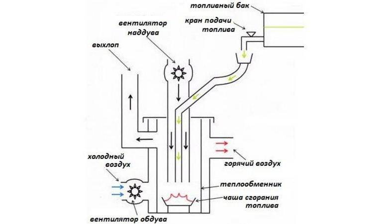 Si le four a une alimentation manuelle en combustible, dans la chambre inférieure, le développement et l'allumage sont versés à travers un trou spécial au fond de la chambre. Avec un système de carburant automatisé, un tuyau de dérivation mène à la chambre, qui est reliée à un récipient rempli d'huile usée.