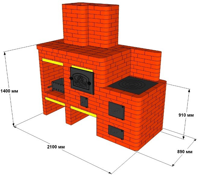 Un tel poêle est large, car il combine plusieurs appareils pour cuisiner. La hauteur est déterminée par le nombre de lignes qui fluctue du 23 au 27 de la fondation (en tenant compte de la cheminée érigée). La largeur du four est d'environ 89 à 90 cm, longueur - environ 140 cm, surface de base totale - 12600 cm2.