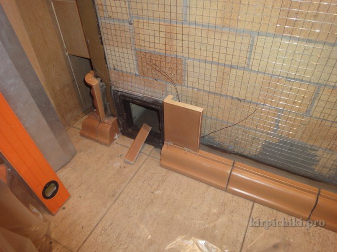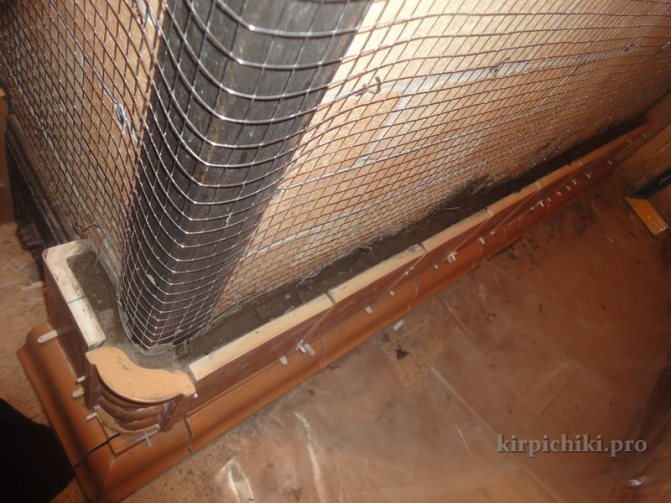 - Ensuite, fixez l'armature en acier d'une épaisseur de 5 mm au fil. Le parement de la cheminée carrelée y sera attaché. Pour améliorer la fixation, après la verrière du carreau, pliez le bord de la goupille vers le haut, comme sur la photo.