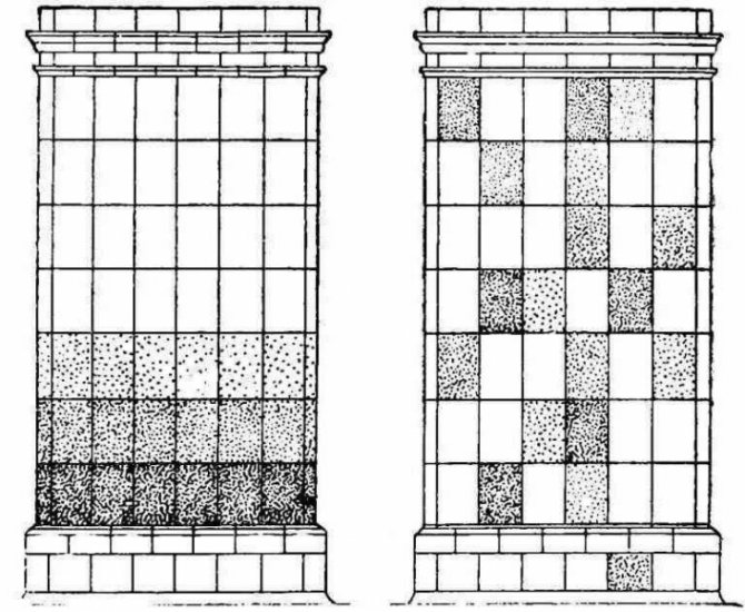 Pour ajuster la teinte des carreaux de la cheminée, faites un aménagement préliminaire. Essayez de poser des carreaux plus foncés dans la partie inférieure du poêle. Choisissez des carreaux pour une transition de couleur dégradée - votre poêle en faïence aura l'air plus solide. Pour une meilleure compréhension, la photo ci-dessous montre des exemples de revêtement du poêle avec des carreaux avec et sans tri.